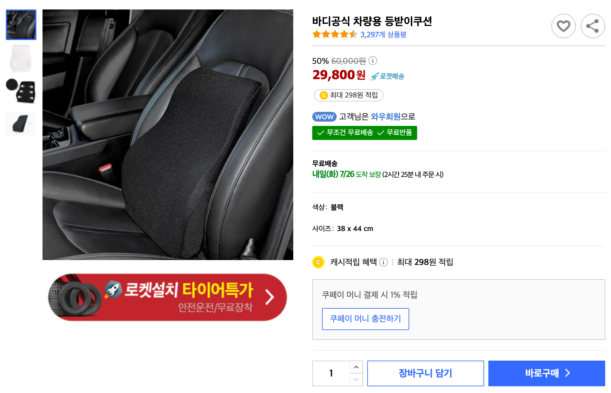일단 쿠팡에서 차량용 요추 쿠션 검색해서 첫 번째로 나오는 제품으로 적당히 선택해서 주문했습니다. 마침 4천 원 쿠폰도 추가로 주네요.